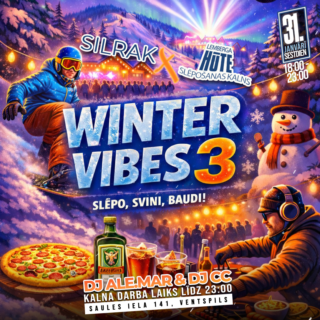 Sestdien, 31.janvārī no plkst. 18.00 kāp uz slēpēm vai dēļa un izbaudi jau trešo ziemas ballīti WINTER VIBES kopā ar Silrak kokteiļu bārs & naktsklubs. Par noskaņas mūziku parūpēsies DJ CC & DJ ALE.MAR! Visas dienas garumā baudi kalna pakājē gardus dzērienus un ēdienus no Silrak.